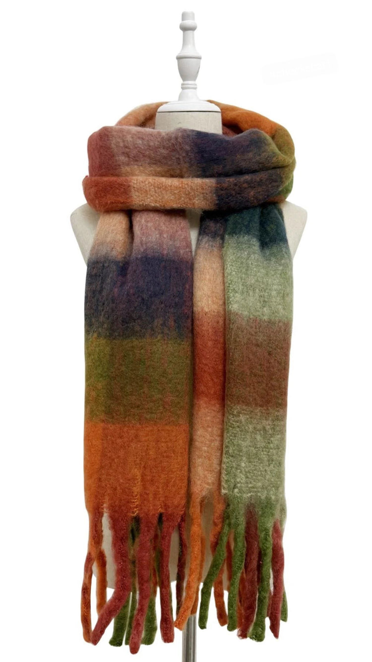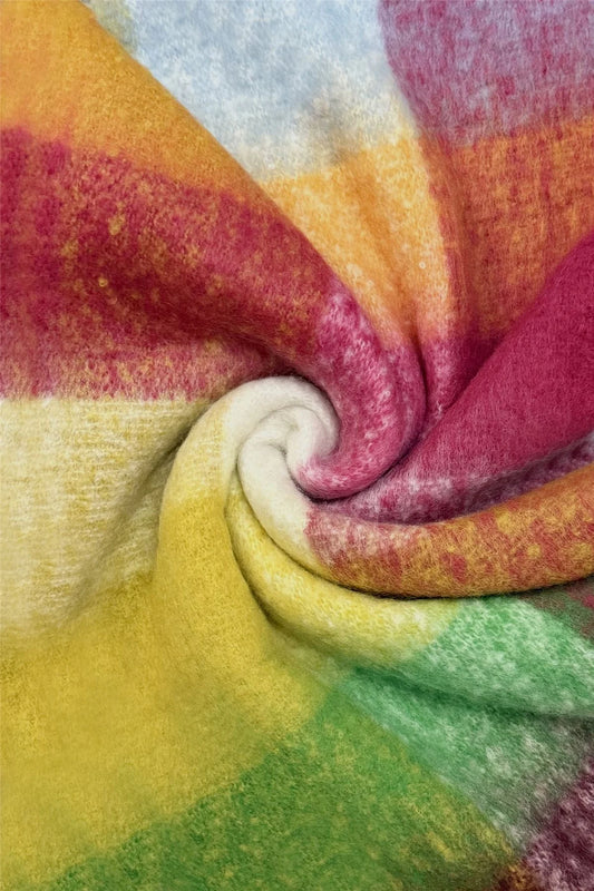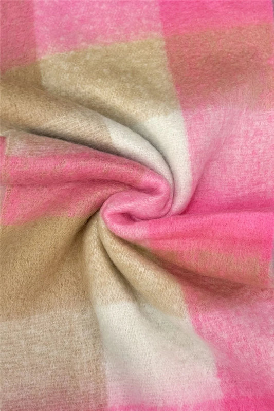 Multi Check Print Wool Tassel Scarf in Barbie Pink