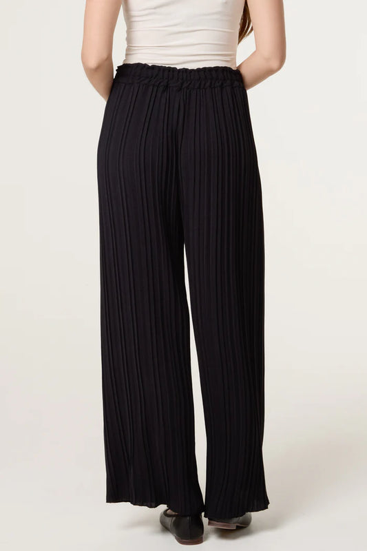 Black Wide Leg Plisse Drawstring Trousers