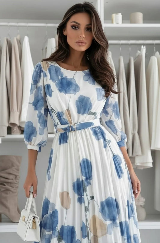 Floral Pleated Belted Dress in Blue