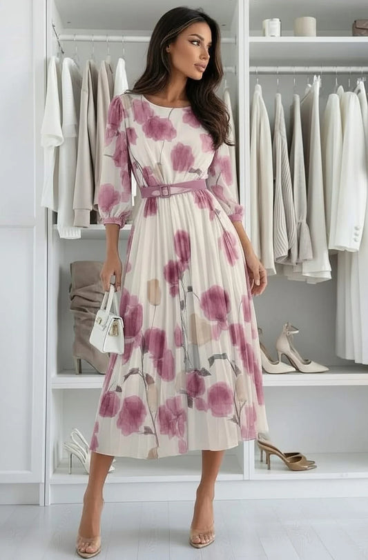 Floral Pleated Belted Dress in Pink